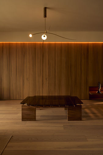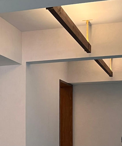 This is a sculptural lighting system, bespoke for Apartment V made from recycled ancient temple rafters, imbedded with upturn strip light for indirect light and suspended by a natural brass clamping system.