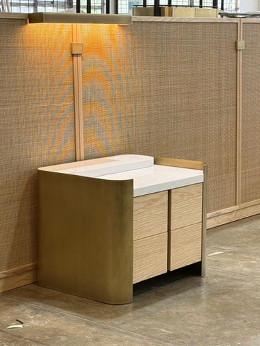 We designed this beside table with 2 levels of table tops to secure electronics in the top level and space for drink ware in the lower level. Rounded, seamless edges are a signature to our studio’s design language. Brass sheets wrap around oak drawers with flushed handles.